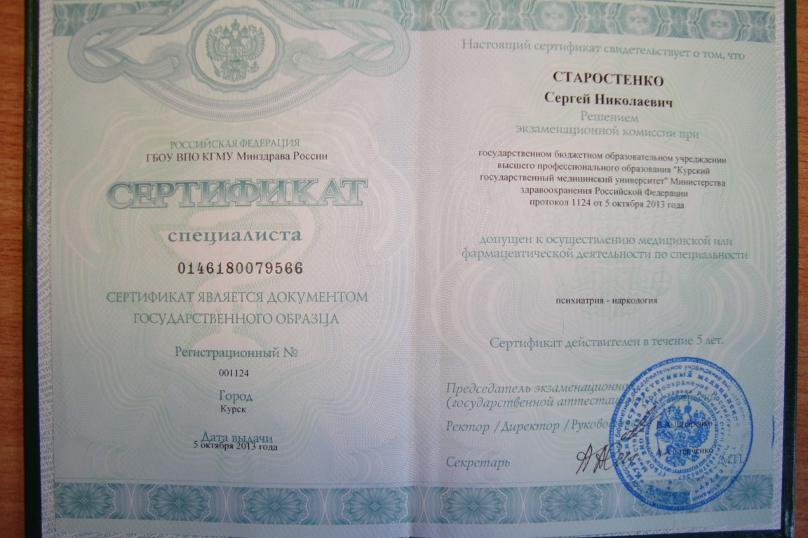 Психиатр — нарколог, специалист по неотложным состояниям в наркологии психотерапевт. 1960 г.р. Профессиональное образование: 1986 — выпускник курского Государственного Медицинского Института; 1989 — первичная специализация по анестезиологии —